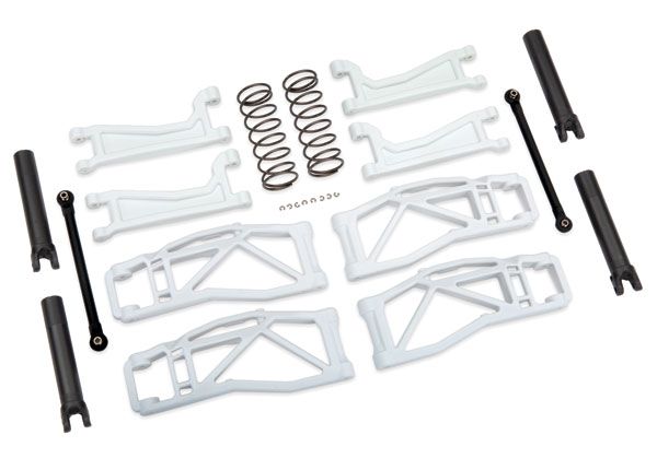 The WideMaxx kit consists of extended versions of the Maxx’s extreme-duty cold-weather suspension arms, available in 6 total colors to allow you to customize your truck to your style. Additionally, new springs are included for the rear of the truck to dial in the suspension settings, while the original rear springs move to the front for optimum balance and performance. Finally, a set of wider toe links for the front finish out the new widened stance.