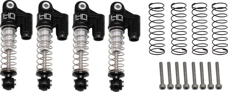 Hot Racing aluminum shocks for the Axial SCX24, or other mini/micro crawler. These shocks are friction damped, requiring only a partial filling of silicone oil. The include a machined reservoir shock cap for realistic scale looks.