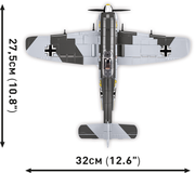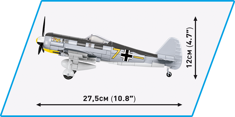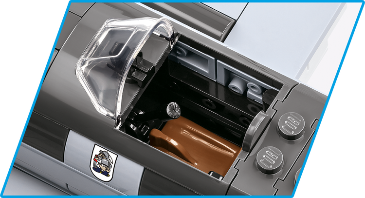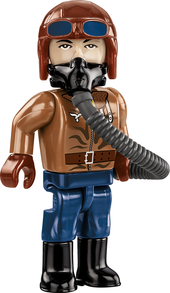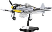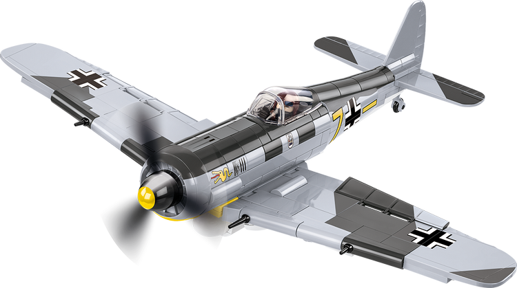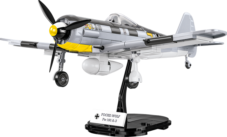 The Focke-Wulf Fw190 A-3 aircraft model, built of COBI construction blocks, is a faithfully reproduced 1:32 scale low-wing aircraft from World War II. The model offers many movable elements such as a rotating propeller, movable wing ailerons and wheels with rubber tires that can be folded to a horizontal position. Reproduced details and historic colors of the aircraft are photo realistic. The cockpit can be opened to place the German ace-inspired pilot figure in the seat. Thanks to a special display stand with a plate containing the name of the plane and a place to attach the figure the whole set looks great! The model also features durable prints and historical markings.
