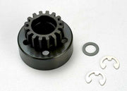 The 15-tooth (1.0 metric pitch) clutch bell is made from durable steel for long-lasting performance. Includes 5x8x.5 mm fiber washer and 5 mm E-clips (2). Clutch bells are available in a variety of sizes to fine-tune your truck's gear ratios for more torque or higher top speed. (Requires two 5x10x4 mm ball bearings.)Replacement part for these models: