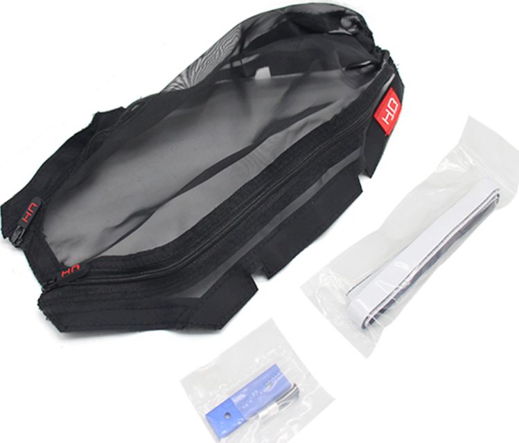Cubierta de chasis de protección contra suciedad de Hot Racing para el Traxxas 2WD Slash a escala 1/10 con el chasis normal (no LCG). La cubierta del chasis se fija al chasis con cinta de velcro fácil de aplicar; tiene acceso al chasis con cremallera; y utiliza una malla de nailon transpirable para repeler el agua y proteger el chasis de la suciedad y los escombros.