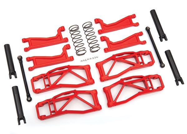 El kit WideMaxx consta de versiones extendidas de los brazos de suspensión para climas fríos de servicio extremo del Maxx, disponibles en 6 colores en total para permitirle personalizar su camioneta según su estilo. Además, se incluyen nuevos resortes para la parte trasera de la camioneta para ajustar la configuración de la suspensión, mientras que los resortes traseros originales se mueven hacia la parte delantera para lograr un equilibrio y rendimiento óptimos. Finalmente, un conjunto de eslabones más anchos para los dedos de los pies en la parte delantera completan la nueva postura ampliada.