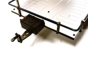 Ahora puede remolcar su ganador de la competencia o su máquina de senderos con estilo a la siguiente competencia con nuestro nuevo remolque para automóvil de doble eje y plataforma plana de aleación mecanizada. Hecho de aleación, el remolque de plataforma mide 515 mm x 316 mm x 120 mm (largo x ancho x alto) con un área de carga de aprox. 400 mm x 250 mm y puede transportar muchos vehículos a escala 1/10, como el Axial SCX-10 y otros. Junto con la suspensión de ballesta y ruedas y neumáticos realistas de 1.9, el remolque también cuenta con un soporte retráctil delantero que funciona, guardabarros de aleación, rampas de carga deslizables de aleación con un pasador de bloqueo con cadena (como el modelo real), un par de escala D -anillos y una caja de "caja de herramientas" en la parte delantera con un interruptor de palanca y espacio para albergar la caja de batería incluida que alimenta los LED de las luces de freno incluidas. El remolque de doble eje de aleación mecanizado está disponible en plateado con detalles en azul, bronce, naranja, rojo o plateado. NOTA: Se requiere algo de ensamblaje.