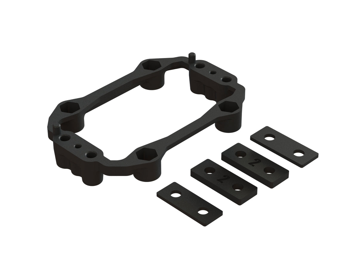 El marco compuesto moldeado añade rigidez al conjunto de montaje del servo de aluminio y mantiene los tornillos del montaje del servo en su lugar. Se incluyen espaciadores de montaje del servo compuestos moldeados de 1 mm y 2 mm de espesor para ajustar con precisión la altura de montaje del servo.