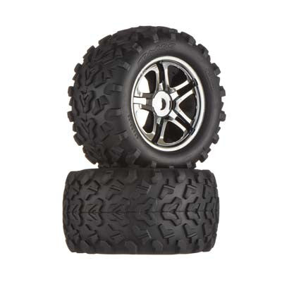 Este es un par de neumáticos y ruedas Traxxas Maxx. CARACTERÍSTICAS: Se adapta a la escala 1/10 Traxxas E-Maxx, T-Maxx y Revo Ruedas de plástico con diseño de radios divididos y cromado negro. finalizar Neumáticos de goma Maxx con inserciones de espuma. Para usar con tuercas y cubos de rueda estriados de 17 mm INCLUYE: Dos ruedas con neumáticos Maxx e inserciones de espuma Especificaciones: Diámetro exterior: 6,3" (160 mm) Ancho: 3,14" (80 mm) Tamaño hexagonal: 17 mm