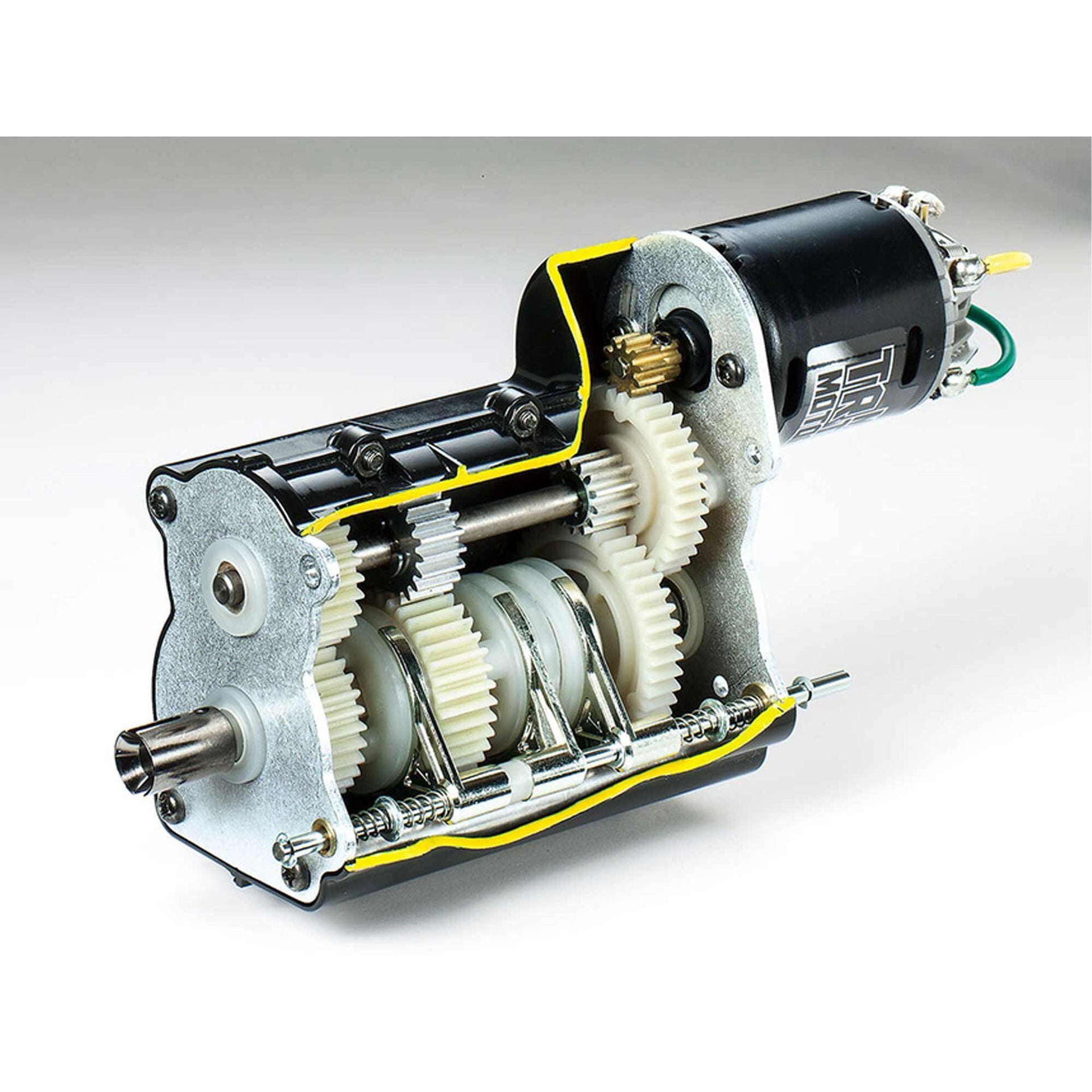 El potente motor TR (35T) proporciona a los ejes traseros gemelos suficiente potencia para transportar cargas en la plataforma del camión. La transmisión de 3 velocidades se puede controlar mediante un transmisor R/C de 4 canales que se vende por separado.